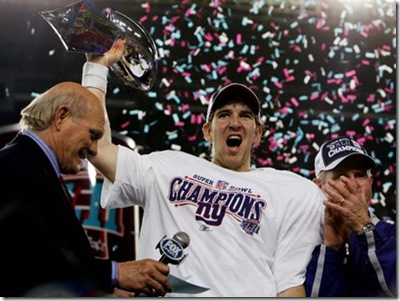 Superbowl picture, Eli Manning Holding the Vince Lombardi Trophy (Harry How/Getty Images via ABC)