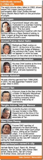 The grainy eight-minute video footage which was taken in 2002 at Lingam’s Kelana Jaya house showed Lingam expressing concern that the outgoing CJ Mohamed Dzaiddin Abdullah was moving his 'men' into top judiciary posts. The conversation revolved around the urgent need to get Ahmad Fairuz appointed as Court of Appeal President (No. 2) and then Chief Justice (No. 1). Lingam expressed his plan to get tycoon Vincent Tan, a close ally of then Prime Minister Mahathir Mohamad, and Tengku Adnan Tengku Mansor, a minister in PM's Department (current Tourism Minister) to talk to Mahathir on the appointment of judges. Allegedly, this was in return for Ahmad Fairuz's "suffering" in the election petition cases in the past where Ahmad Fairuz had ruled against the Opposition.